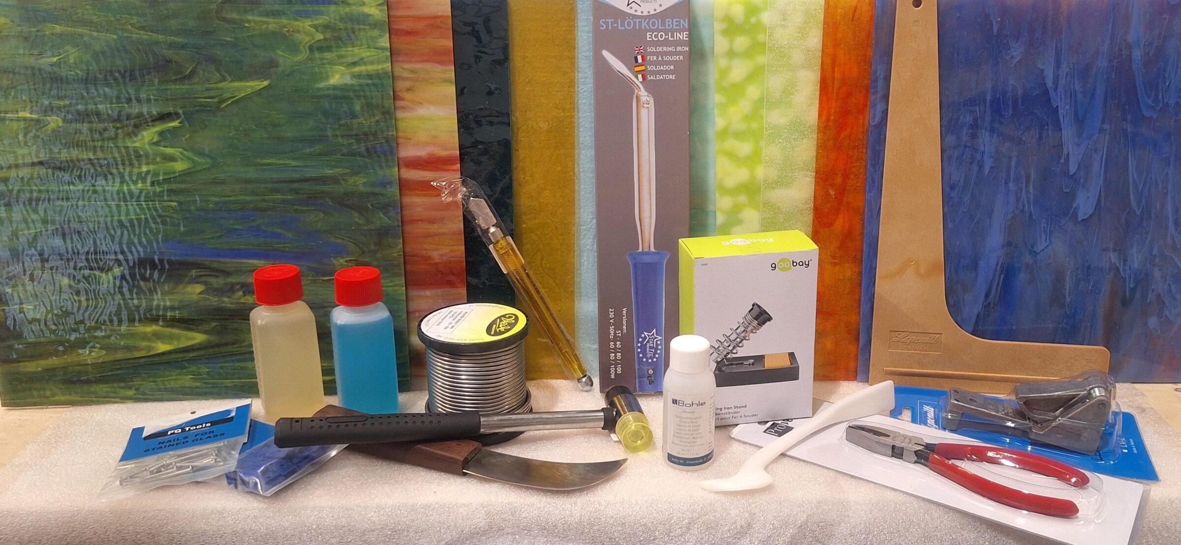 Komplettes Starterpaket für den Einstieg in die Glasmalerei, beispielsweise nach einem Workshop oder nachdem Sie Beispiele gesehen haben.